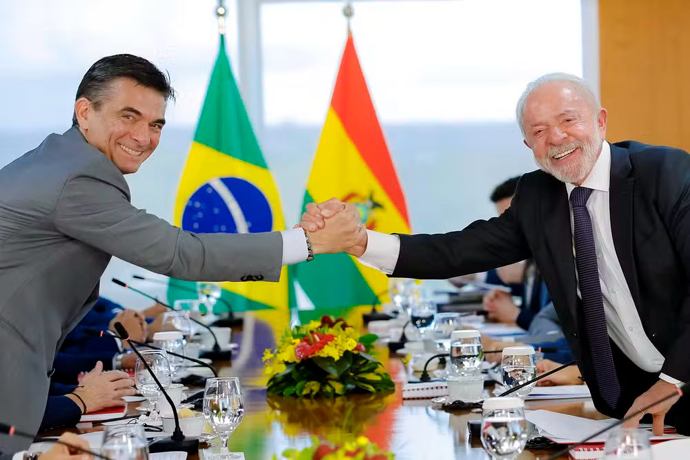 △巴西总统卢拉在总统府与玻利维亚总统帕斯会晤