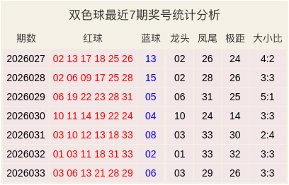 上期双色球的开奖号码中,龙头凤尾组合为03+29,极距为26,大小比为3:3。