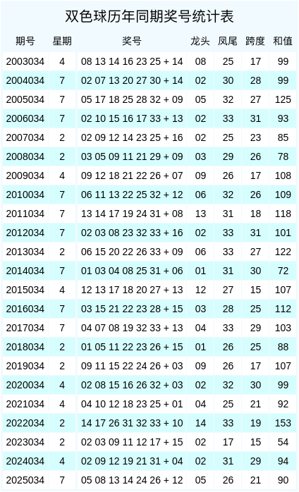 上期开奖号码的红球和值为100,跨度为26,龙头为03,凤尾为29。