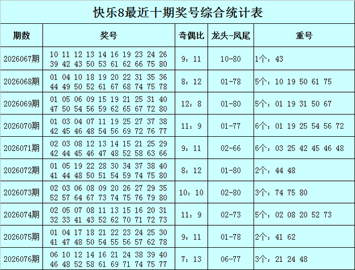 福彩愉快8第2026076期开出奖号:06 10 12 14 16 21 24 38 39 40 46 48 52 58 61 69 71 74 75 77,其中奖号奇偶比为7:13,出现3个重号21、24、48,开出连码38 39 40、74 75。