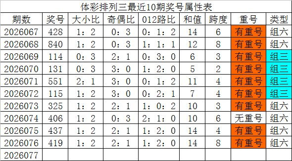 体彩罗列三最近10期分辨开出奖号:428、840、114、131、551、115、325、406、437、419,各奖号属性详见下表: