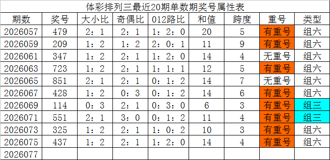 体彩罗列三最近20期单数期奖号分辨为:479、209、347、723、851、428、114、551、325、437,各期奖号注意属性下表: