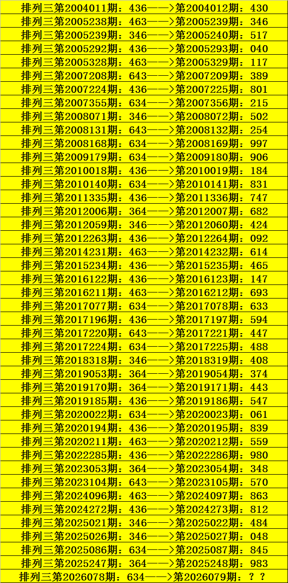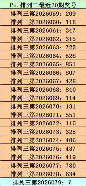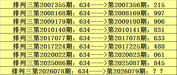 第2026078期成列三奖号为634,历史上该号码直选出现9次,下期奖号区别为:215、997、906、831、633、488、061、845。