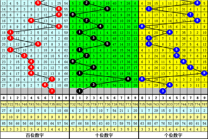 百位:现时遗漏最大的号码为9,遗漏68期,历史上该号最大遗漏为68期,本期百位延续摒除号码9。