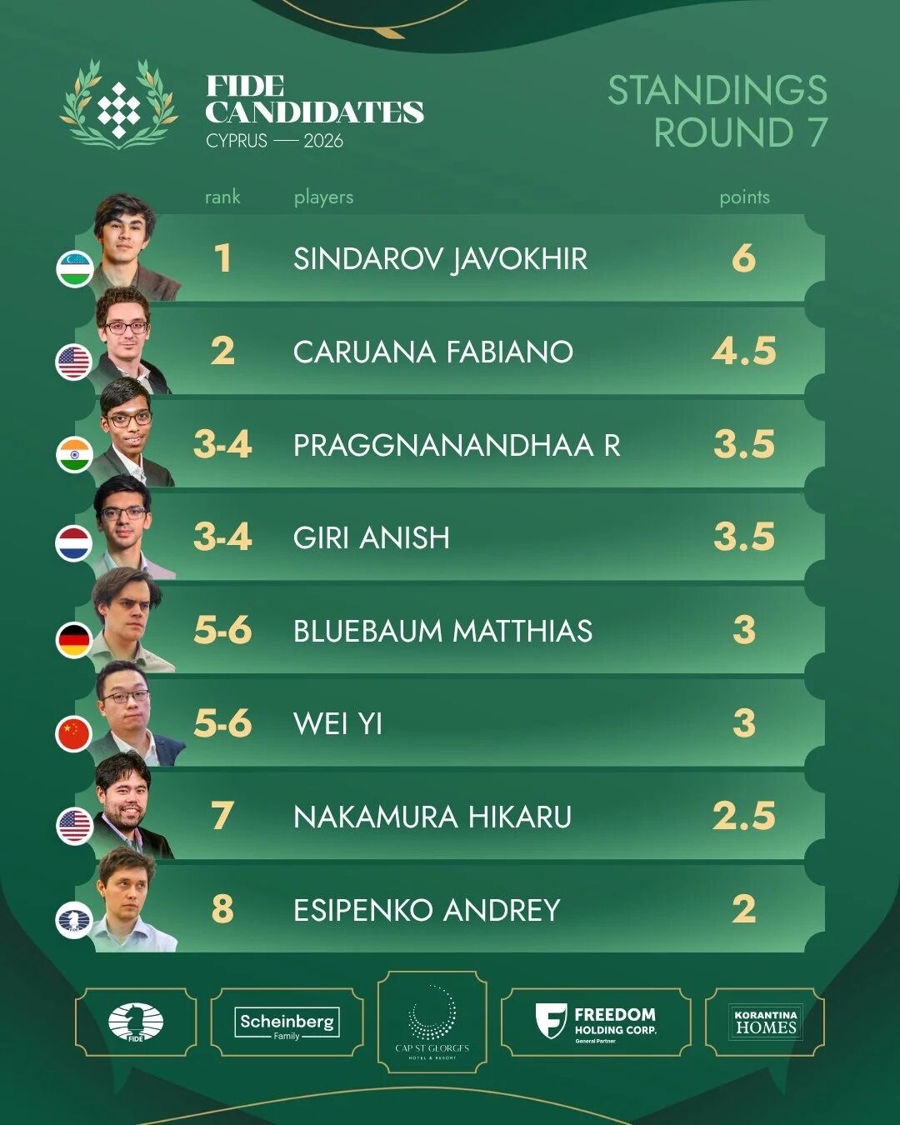 本轮其他三盘均下成和棋。辛达洛夫对阵吉里一度获得上风,但吉里退守功力深厚,两边在第85步捏手言和。普拉格纳南达与卡鲁阿纳一战,印度棋手采用斯拉夫提防,但卡鲁阿纳的大意令前者破耗了渊博时辰念念考,最终两边三次换取明作和。布鲁鲍姆雷同在中村光的顽强退守中无功而返。这么,前7轮箝制,乌兹别克斯坦新星辛达洛夫弘扬拉风,以6分领跑,比死后的卡鲁阿纳多了1.5分。普拉格纳南达和吉里同为3.5分,终了首胜的韦奕与布鲁鲍姆同积3分。中村光2.5分,埃西彭科2分垫底。