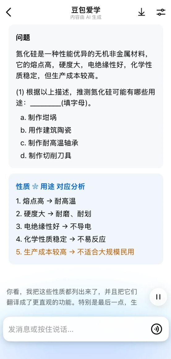 在我的启发下,她又输入给豆包爱学一个问题,“高中生写稿文如何幸免‘假大空’又能得高分”,很快获取了一份长达上千字的讨教,女儿读完后说,“老爹,比你那本开导东谈主写稿文的书讨教得好”,我有点儿不屈气。在女儿用AI拍摄完一谈化学功课,缓缓看解题过程,我野心再发表点成见时,她说:“您去书斋休息吧,这题估量一滑您也看不懂。”这话倒也在理,我的特长毕竟也不是化学。