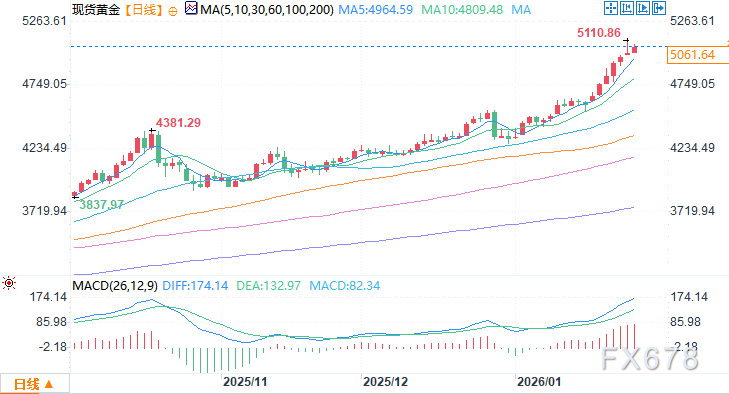 北京时间1月27日13:02 现货黄金 报 5061.64美元/盎司