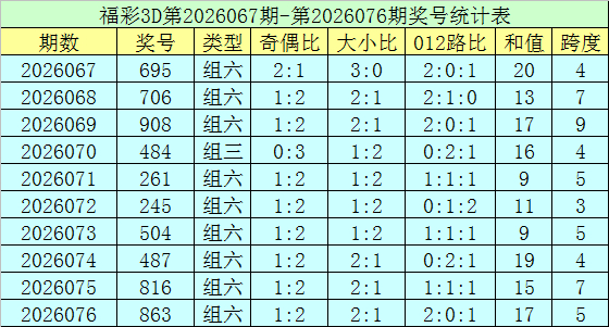 上期追忆:福彩3D第2026076期开奖号码为863,组选类型为组六,奇偶比为1:2,大小比为2:1。
