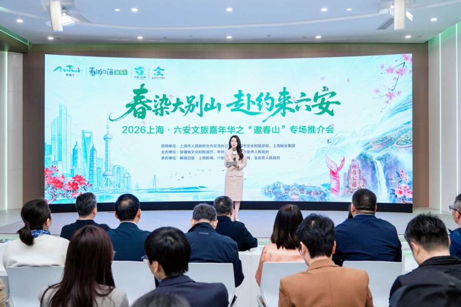 大别山的春意一说念吹到了黄浦江畔。4月10日至11日,2026上海·六安文旅嘉年华之“邀春山”专场推介行动在上海报业大厦举行。茶香、非遗庐剧、老区故事,这场以“春染大别山,赴约来六安”为主题的行动,把五百公里外的春天,“打包”送到了上海市民的家门口。